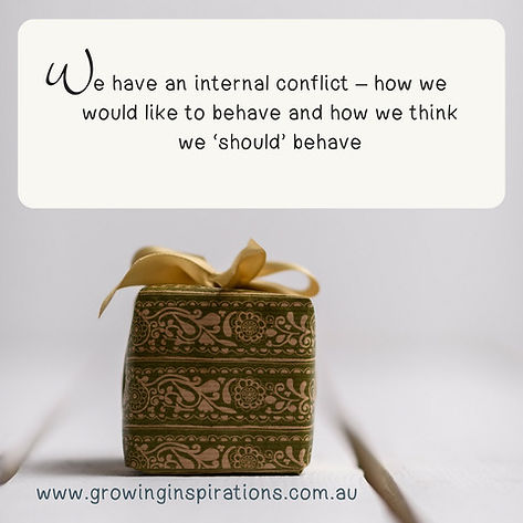 It’s about an internal conflict – how I would like to behave and how I think I ‘should’ behave. We are constantly juggling those two elements and making decisions about how to act, what to say, in order to achieve the outcome that we feel serves us best. The outcome we seek may be family harmony, personal or physical wellbeing or financial benefit. It may be gaining approval or building our sense of our worth.